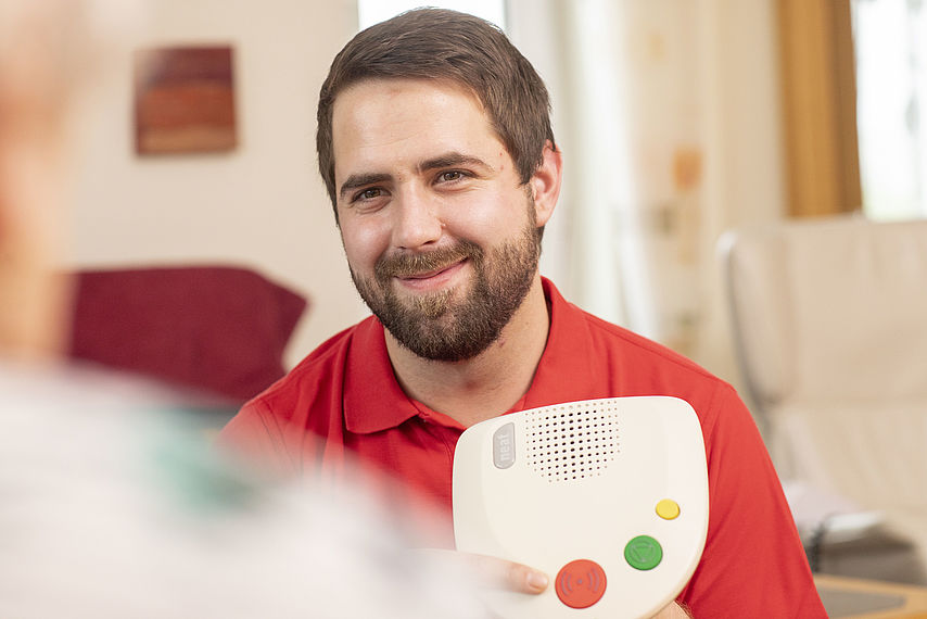 Sie können unsere Hausnotrufzentrale im Notfall einfach per Knopfdruck alarmieren. Sie tragen den Funksender entweder wie eine Uhr am Arm oder an einer Kette um den Hals. Unsere Hausnotrufzentrale ist an jedem Tag rund um die Uhr besetzt. Im Notfall leisten wir schnelle Hilfe nach Ihren Bedürfnissen und gesundheitlichen Erfordernissen. Im Vorfeld können Sie bereits festlegen, wie wir verfahren und welche Personen wir informieren sollen.
